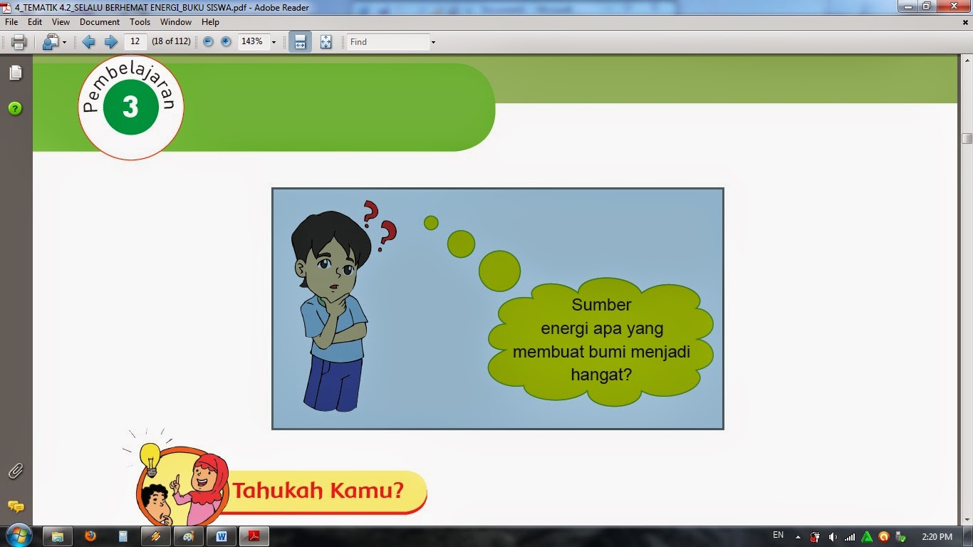 1. Pertama, bukalah file pdf yang akan Anda copy sambil juga Anda harus buka mata. Misalnya saya membuka file buku siswa kelas 4. (Saya menggunakan aplikasi Adobe Reader 8) Anda belum kenal? Ini penampakannya Bro!